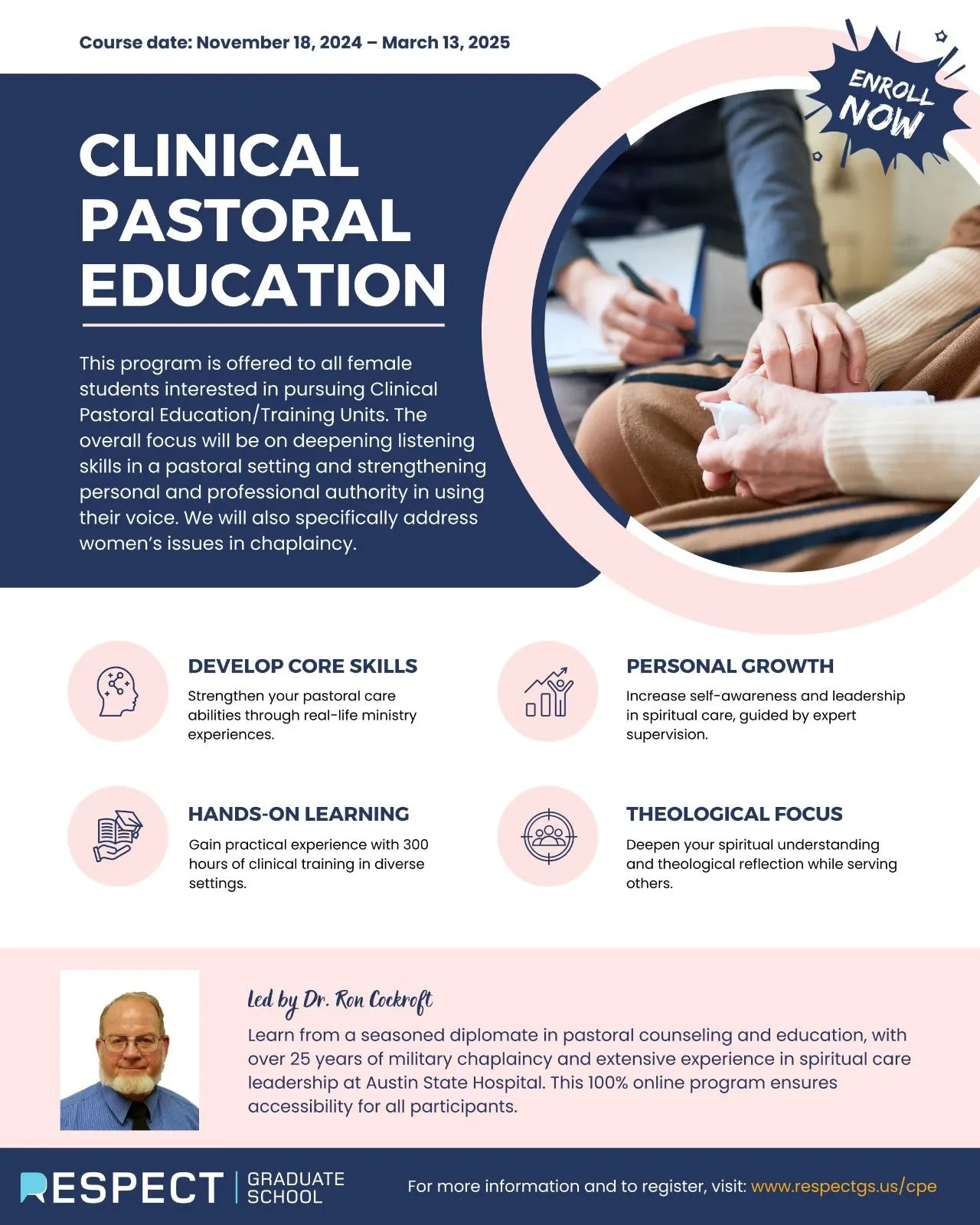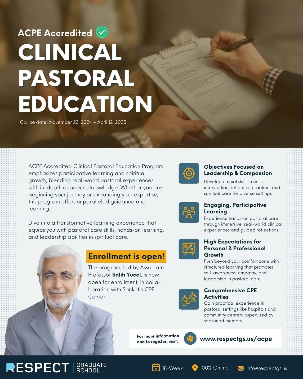 Son üç yılda pek çok gruba verilen bu eğitimle, katılımcılar hem Chaplain'lik alanında mesleki bilgi edinmekte hem de manevi rehberlik ve danışmanlıkta kişisel gelişim fırsatı yakalamaktadır. Kadınlara yönelik olarak 18 Kasım'da başlayacak olan bu yeni CPE programı, manevi bakım ve rehberlik becerilerini güçlendirmek isteyenler için özel olarak tasarlandı. Katılımcılar bu programda, ruhani bakımda profesyonel ve kişisel gelişim yolculuğuna adım atacak ve çeşitli inançlardan bireylerin bulunduğu interfaith (dinlerarası) topluluğa dahil olma fırsatı bulacaklar.