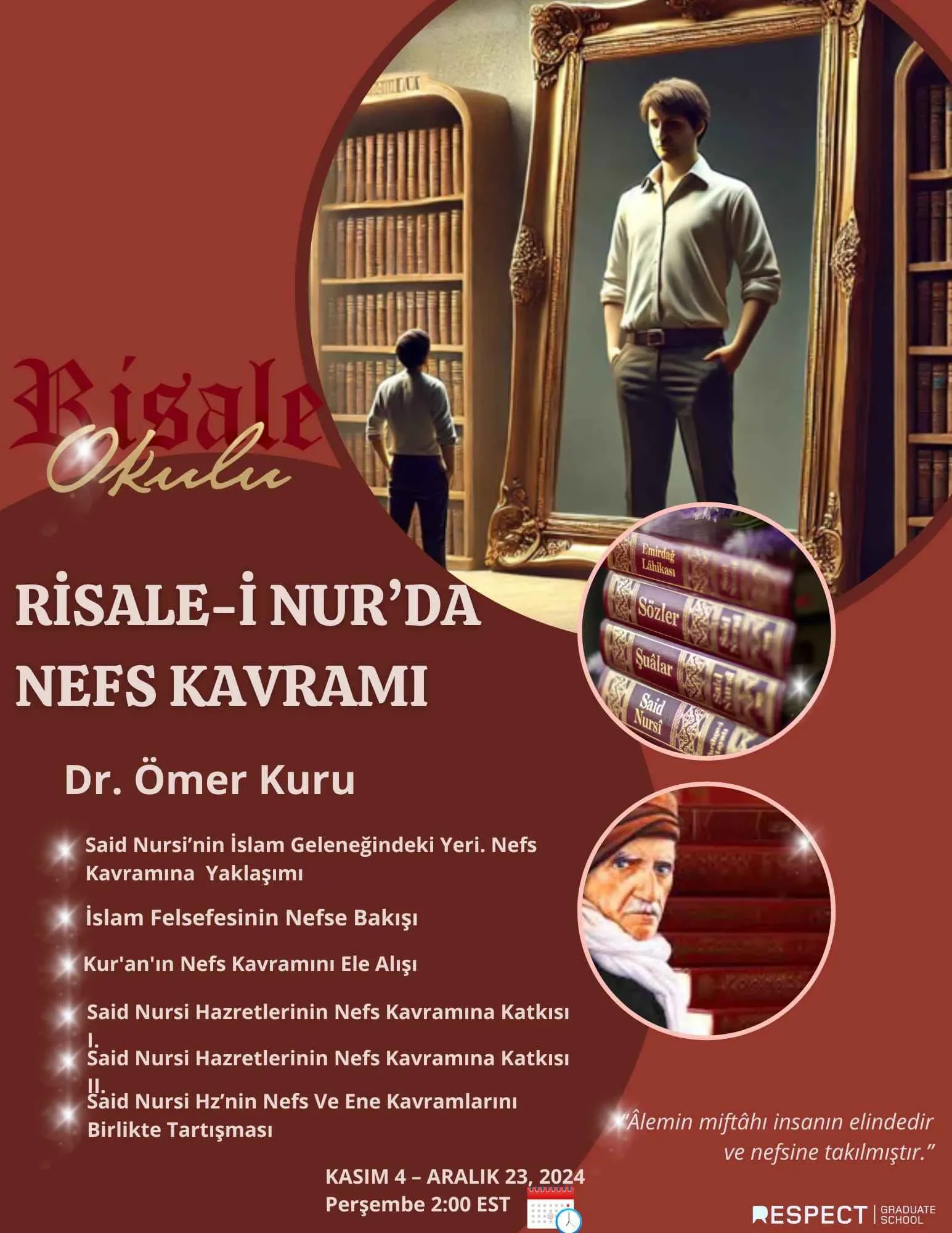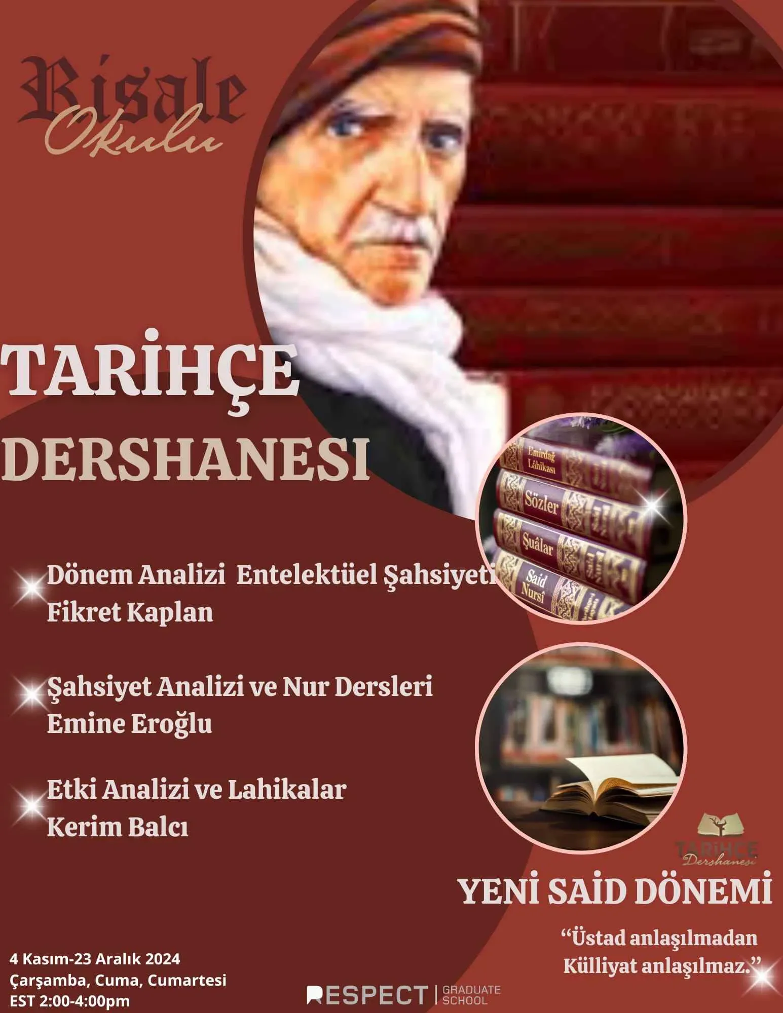 Respect GS'nin de katkılarıyla John Carroll Üniversitesi'nde (Ohio) "Batı'da Risale-i Nur Çalışmalarının Geleceği" konulu konferans düzenleniyor. Konferans, Said Nursi’nin mirasının Batı'da akademik bir boyutta tartışılmasına, günümüz toplumuna etkilerinin ele alınmasına odaklanacak. Katılımcılar, Nursi'nin düşüncelerinin 21. yüzyıldaki önemini ve hoşgörü gibi değerlerin modern toplumda nasıl yaşatılabileceğini tartışacaklar. Yüz yüze ve çevrimiçi (online) yapılacak konferansla ilgili daha fazla bilgi ve kayıt için risaleconference24.org adresini ziyaret edebilir ve konferans içeriğini buradan görüntüleyebilirsiniz.