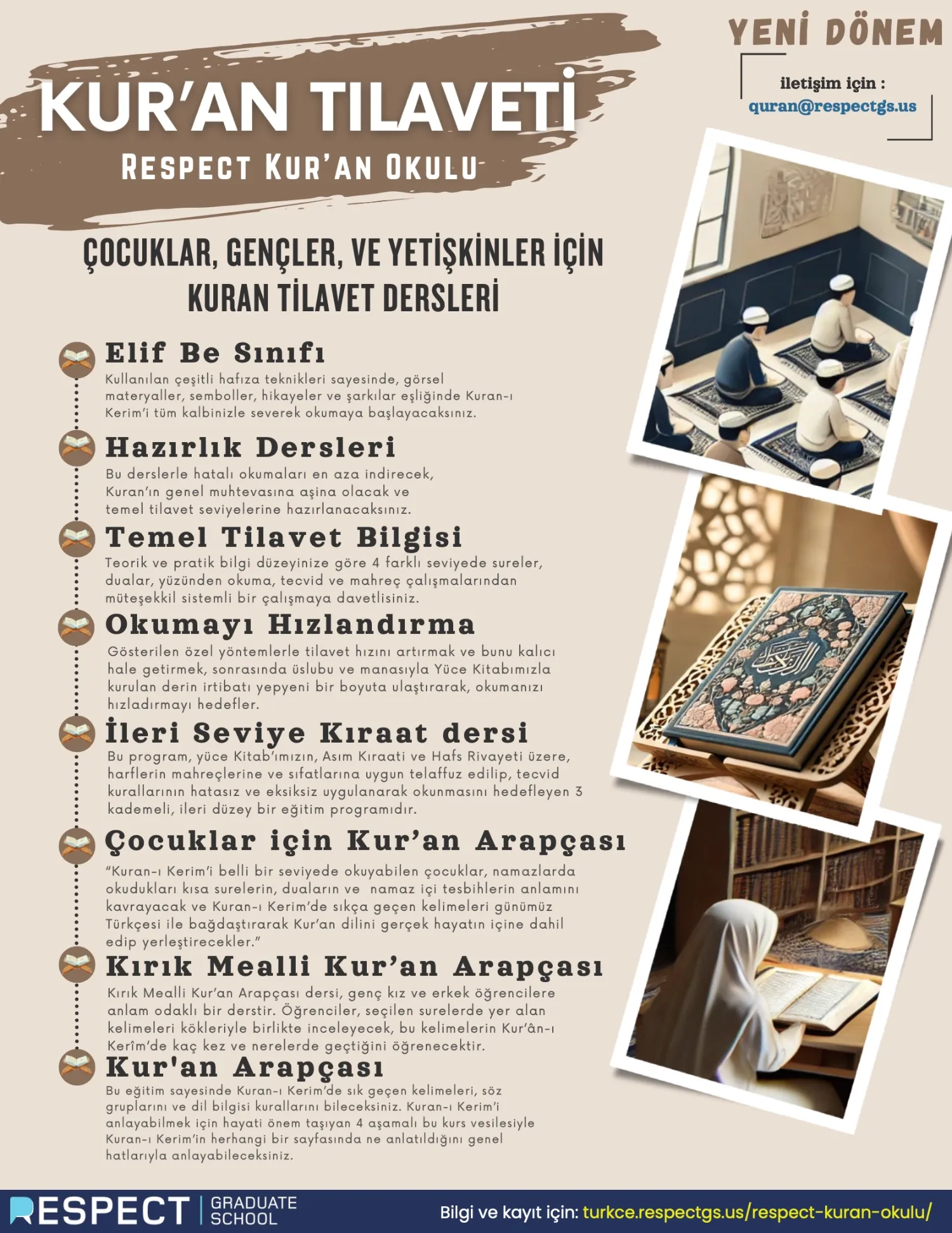 Ayrıntılı bilgi ve kayıt için Respect Kuran Okulu internet sayfasını ziyaret edebilir, iletişim için [email protected] adresine e-posta gönderebilirsiniz.