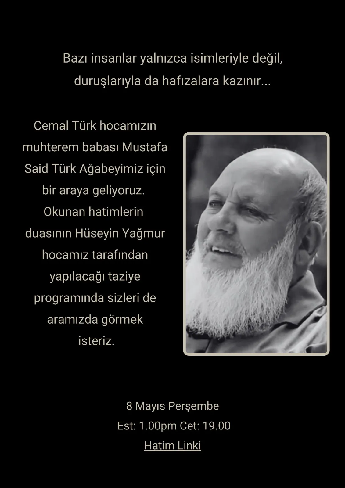 Ramazan bayramının ilk günü ruhunun ufkuna yürüyen, Cemal Türk Hocamızın muhterem babası Mustafa Said Türk Ağabey için okunan hatimlerin duası, gerçekleştirilecek taziye ve dua programı ile yapılacaktır. Aile fertleri ve dostlarına taziyelerimizi iletmek üzere siz kıymetli dostlarımızı da aramızda görmekten memnuniyet duyarız.